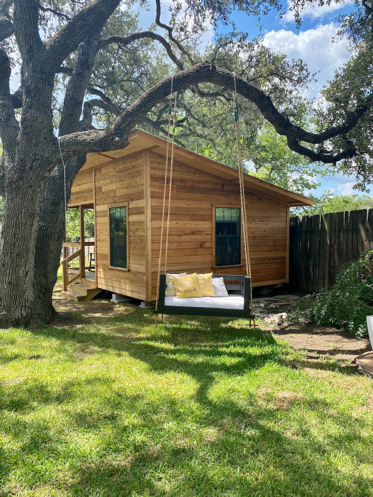 This adorable, tiny home is situated perfectly amid 2 gorgeous, oversized oak trees. Come hang out on the large swing, just steps from your cabin door and take in the tranquil atmosphere where its easy to see the the stars. Or hang out on your front porch and rock the day or night away. This unique and tranquil getaway is located on an acre lot shared with an 1883 built historic home & 2 other small places. Kitchenette/Grill/firepit/ hammocks. Located less than 1 mile from Maine Street Boerne.
