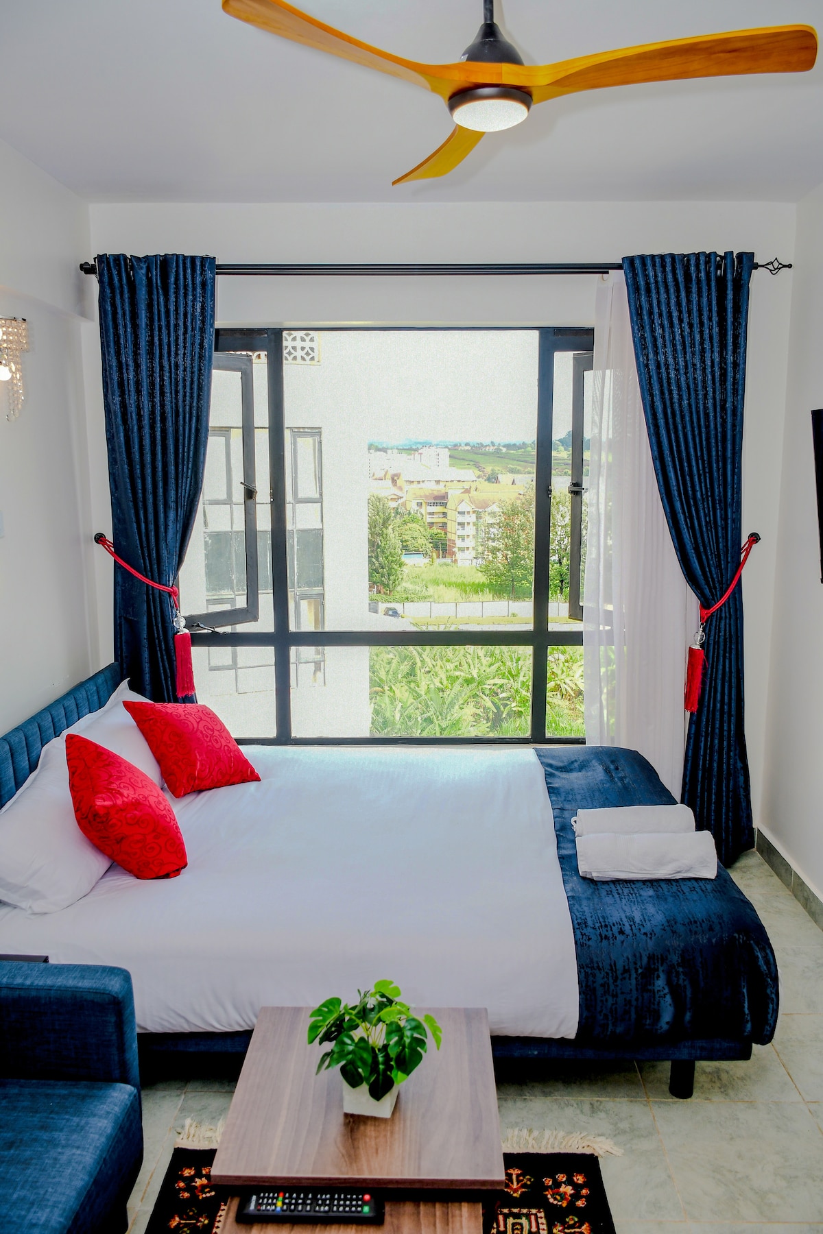 This studio apartment in the heart of Thindigua, Kiambu is your perfect escape from busy city life. This top-floor calm & stylish space--with an ensuite shower and toilet, and modern kitchenette--offers a haven where you can unwind & recharge. Standout features include an orthopedic bed and mattress, chic sofa, smart TV, large capacity refrigerator, built-in gas cooktop, large microwave, state of the art ceiling fan, smart lock, blackout curtains, hot shower, breathtaking views & free parking.