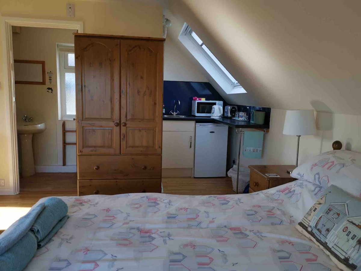 Homely private studio room with ensuite, sitting area and kitchen. This lovely bright room above our detached double garage is separate to the main house giving greater privacy and relaxation. We will provide tea and coffee amenities, breakfast items and fresh linen. The property is set in the sought after village of Kimington in East Devon on the border of Dorset. The village itself has two pubs, a garage and Miller's Farm Shop. It also backs onto Shute woods with numerous walking trails.