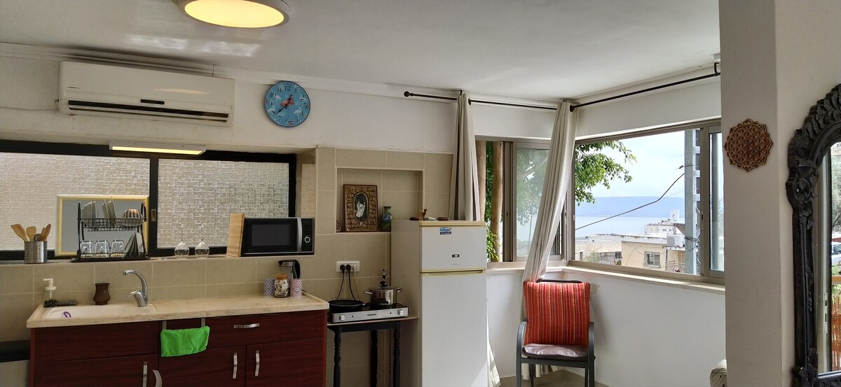 The apartment is located in a quiet area 15 minutes walk to the city center the sea and the promenade of Tiberius. The apartment has a unique view and in general it has a special charm. the room is in second floor House for Guests You'll have to Climb stairs in the room you find Four beds(option for floor Mattresses) ,kitchen(thet he is on the balcony out side),Shower and toilet together,sofa,balcony,kettle (hot water) stove,Air-Conditioner,refrigerator,Bed linen and towels ,Blankets.