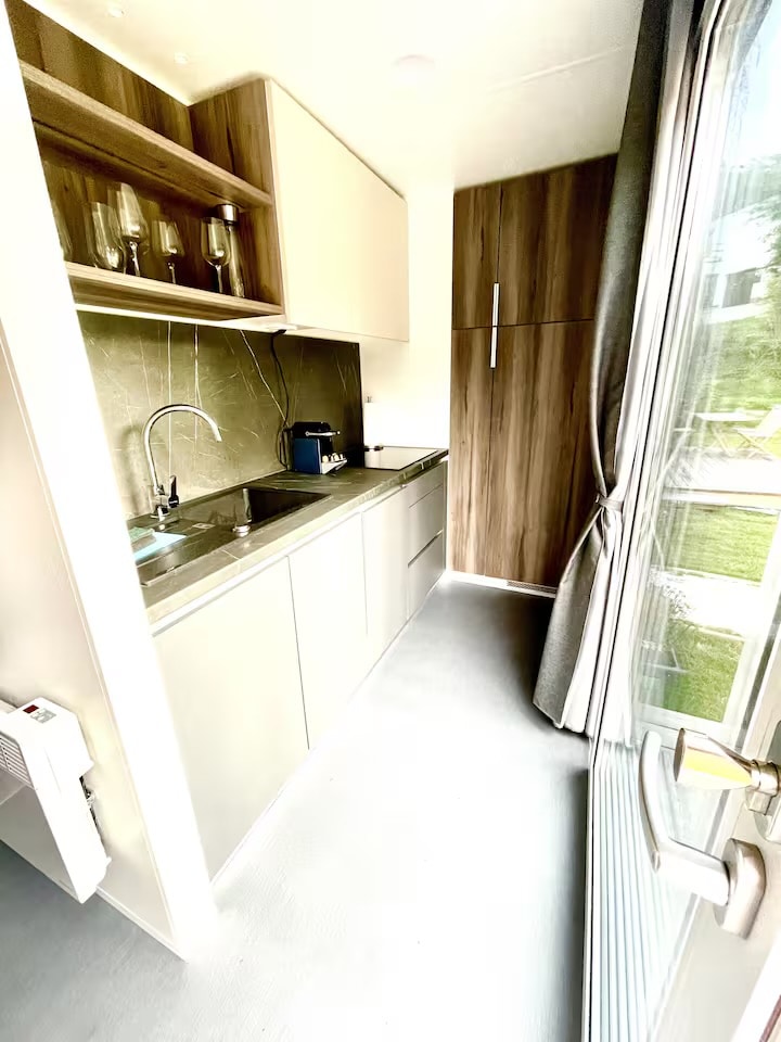 Luxury tiny house with panoramic views – nature, tranquility & comfort! Enjoy absolute tranquility in this stylish retreat surrounded by nature, with a large private terrace with fantastic views of the Karavanke Mountains and the comfort of a top-class tiny house. It offers the highest level of living comfort – perfect for couples, families or groups of friends (for up to 5 people). Two spacious sleeping lofts with connecting gallery. Experience the best of nature, design and comfort