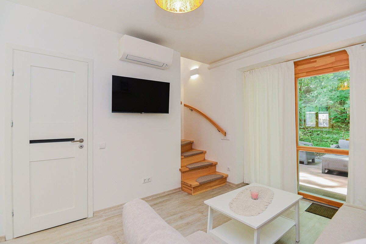 Naujai įrengtas kotedžas su asmenine lauko terasa. Pirmame aukšte yra svetainė sujungta su virtuve, tualetas. Antrame aukšte du atskiri miegamieji. Apartamentuose rasite ko gali reikėti buvimo metu: grilių (iešmai, kepimo grotelės), arbatinukas (arbata, kava), šaldytuvas su šaldymo kamera, kaitlentė, skalbimo mašina, plaukų džiovintuvas, lygintuvas, lyginimo stalas.