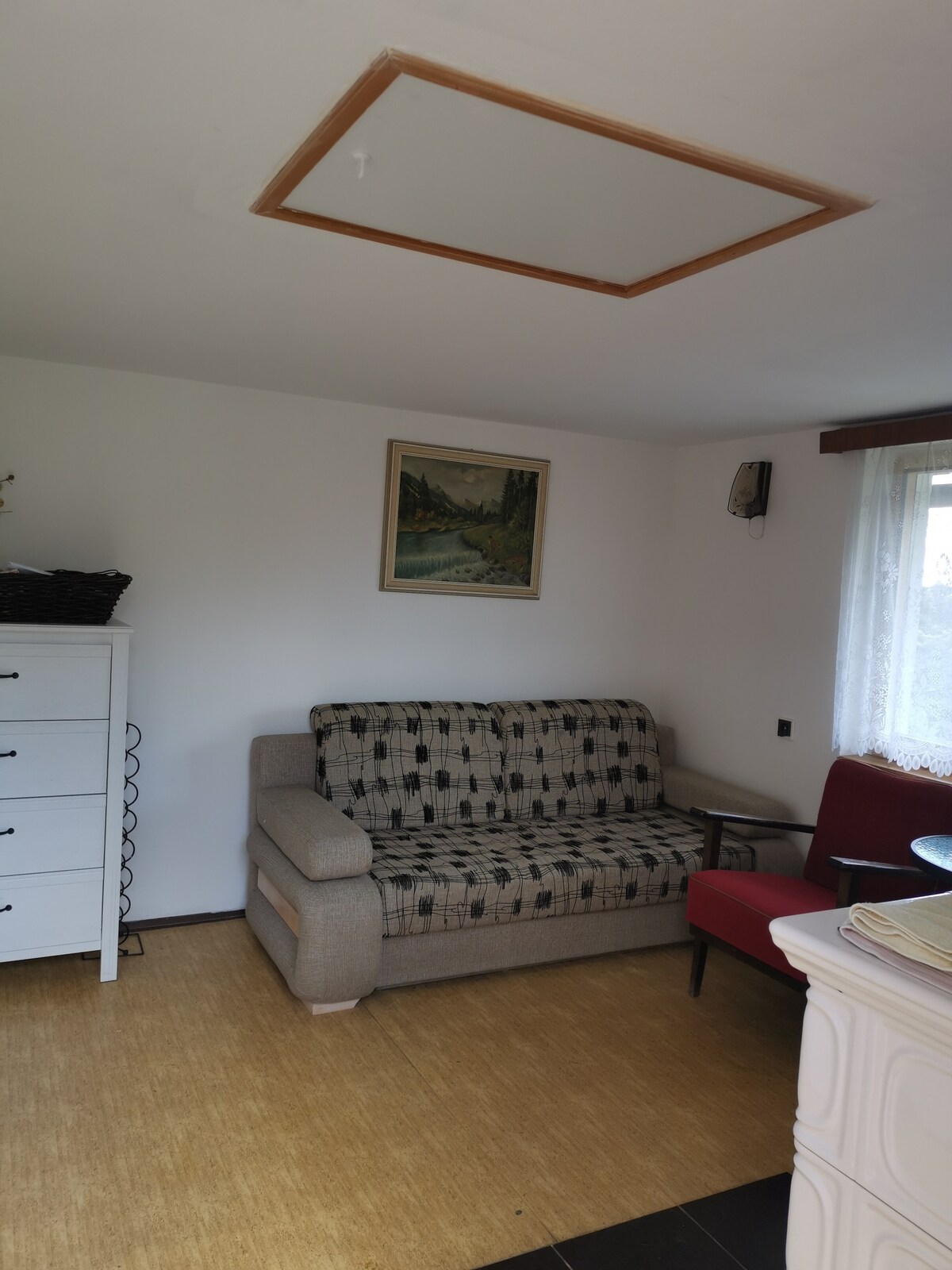 The apartment on the top floor is truly unique. It is located on the second floor and and the entire place has been restored to original building. The original roof wooden frame, exposed brickwork, original flooring, fully functional wooden stove helps you to imagine what people lived like at the beginning of last century. The main living area is facing the front of the house and therefor you will find a view on the town square, town house and the famous basalt rock “Jehla”.