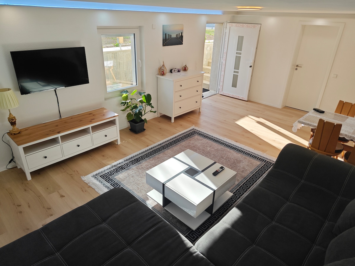 Welcome to our freshly furnished and stylish 2.5-room top floor apartment in Eggingen! The spacious living room with smart TV and Wi-Fi (incl. Netflix UHD) invites you to relax. The fully equipped kitchen offers everything for preparing favorite dishes. A bedroom with a box spring bed guarantees a good and restful night's sleep. The Swiss border is only about 5 minutes away, a great restaurant is in the same building - what more could you ask for.