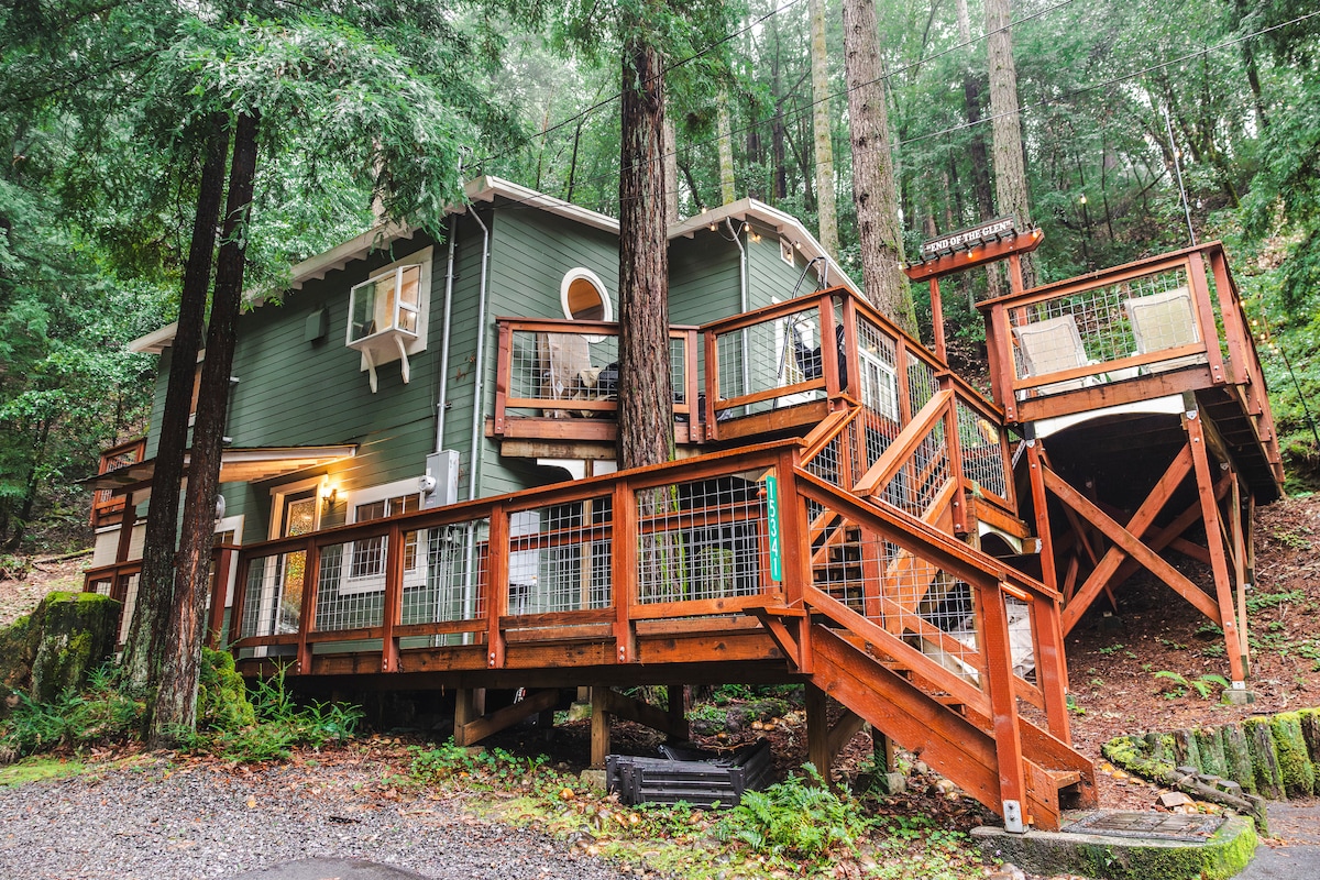 Nestled among majestic redwoods in the historic Rio Nido hamlet near Guerneville, Raven Haus is a delightful Hansel and Gretel cottage. Surrounded by towering firs, the whimsical charm of this cottage captures the essence of a bygone era. Located just a mile from the renowned Korbel vineyards and tasting room, guests can explore the local wine scene. The proximity to the popular Rio Nido Lodge and Roadhouse offers convenient options for dining, drinks, and entertainment within walking distance.