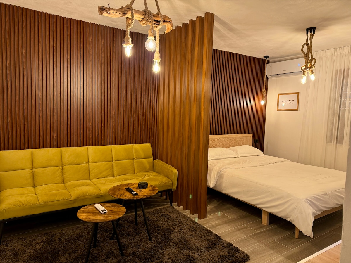 Welcome to your serene escape in the heart of Korce! This luxurious apartment is just a 10-min walk from the charming old bazaar & stunning cathedral, immersing you in the rich local culture. Inside, enjoy a beautifully designed space that combines modern luxury with vintage charm. Relax with the gramophone or unwind in the soothing hot tub after a long walk. Thoughtfully equipped for your comfort, this apartment is your perfect retreat. Experience the unique Korce vibe and create your memories.