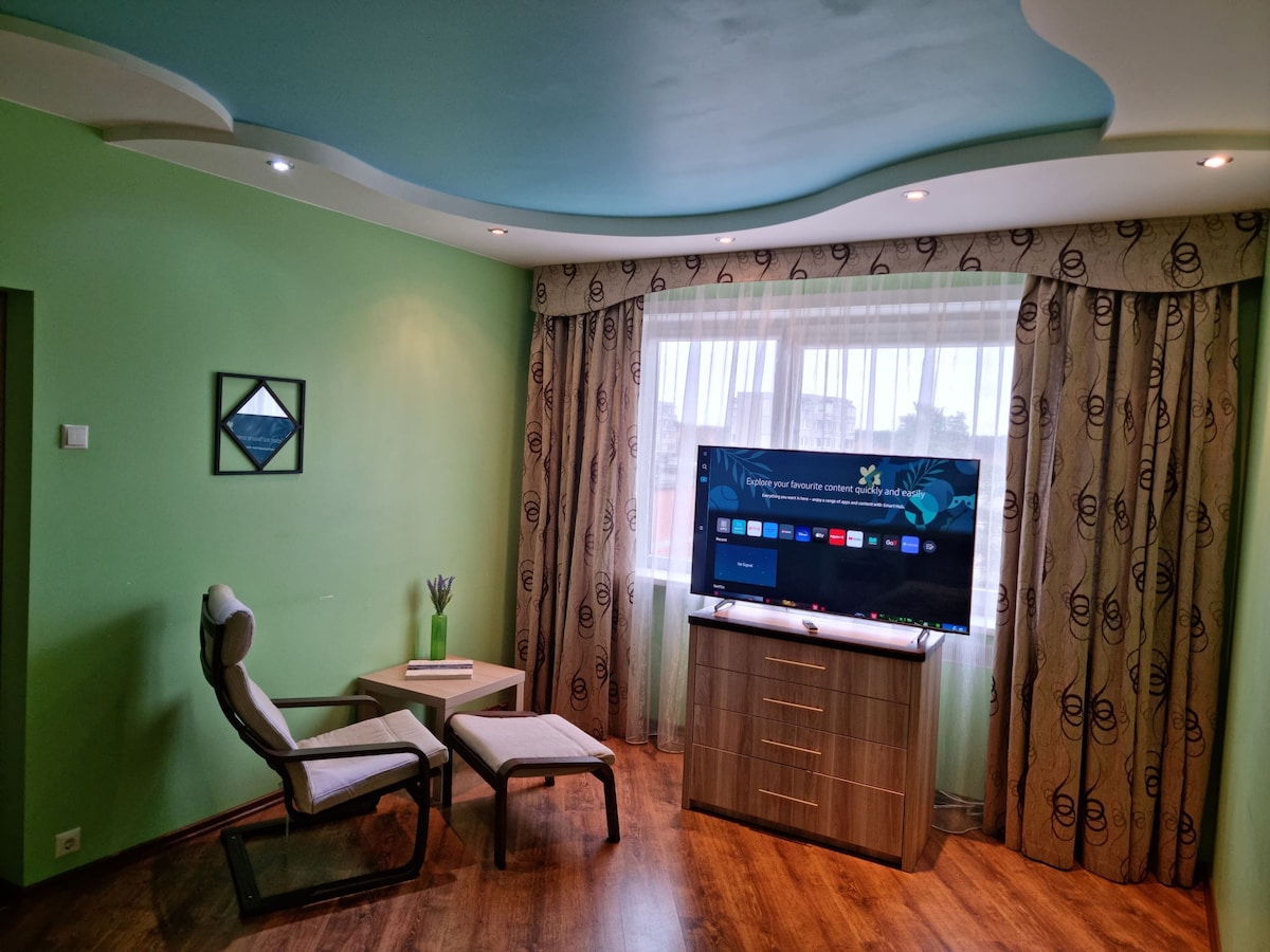 This cozy one-bedroom flat on the first floor is located in the city center and is perfect for 2-4 people. You can feel the countryside atmosphere here, surrounded by a park, with a forest and lake just across the road. The flat features a sunny balcony and is conveniently located near the main city square, shopping center, and grocery stores. It is an ideal place for both business trips and holidays. The apartment is equipped with Wi-Fi, a smart TV, and a washing machine.