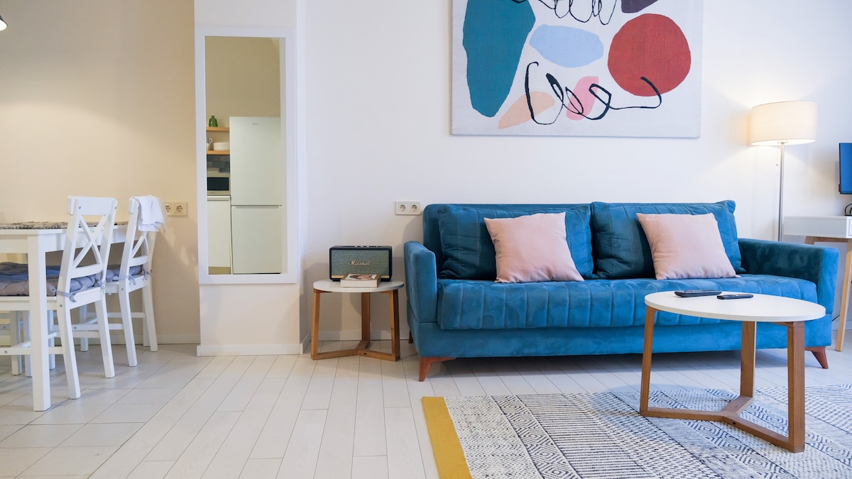 Квартира с одной спальней, большой гостиной и балконом. Интерьер выполнен в стильном дизайне. В квартире есть всё необходимое для проживания: фен, утюг, современная посуда, гели для стирки одежды, душевые принадлежности, одноразовые полотенца, тапочки. Новая техника: стиральная машина, микроволновая печь, духовой шкаф, плита, холодильник, телевизор со Smart TV и HDMI, колонка Marshall. Персональное парковочное место для гостей на автомобиле. В пешей доступности метро и исторический центр.