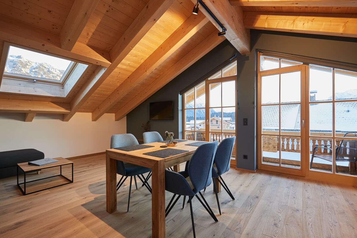 Welcome to the beautiful district of Garmisch. As the epitome of luxury and alpine elegance, our apartments set new standards in the exclusive, just as cosmopolitan and quiet recreation area in Garmisch Partenkirchen. Thanks to its privileged location, the apartment offers you a breathtaking view, where the morning sun welcomes you for a cosy breakfast with a view of the Zugspitze.