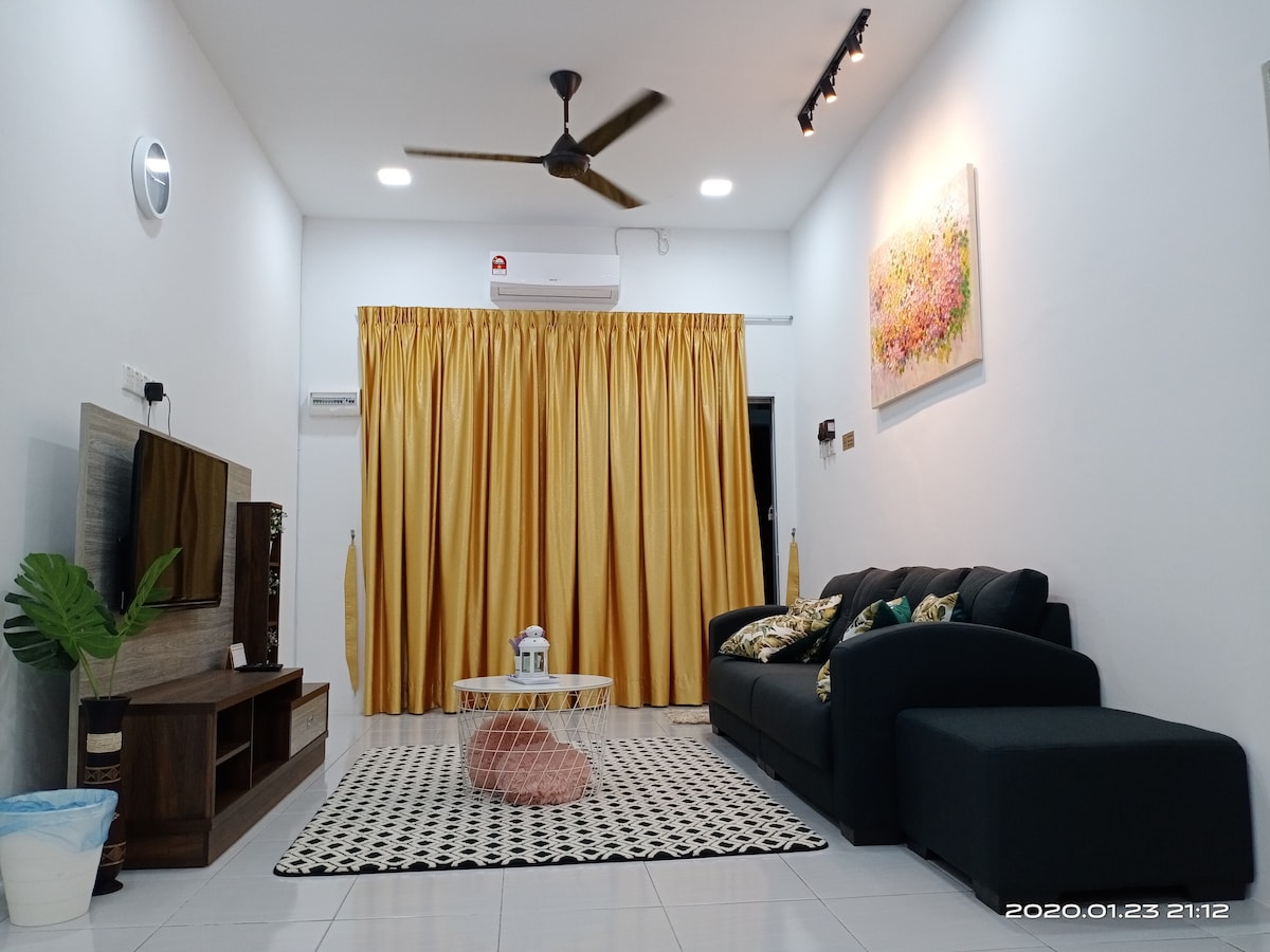Rumah teres setingkat. 3 bilik tidur, 2 bilik air. Semua bilik tidur ada penghawa dingin. Boleh muat 6 hingga 8 orang. Unifi fiber percuma. Televisyen bersama Disney Plus, Prime Video. Ruang dapur yang luas dan selesa. Set kelengkapan dapur disediakan. Mempunyai mesin basuh, Laundry area dan sterika. Berhadapan taman permainan sesuai untuk penginapan keluarga yang ada anak kecil. ββ Merokok, No alcohol, haiwan peliharaan, aktiviti kenduri, dan seumpamanya tidak di benarkan.