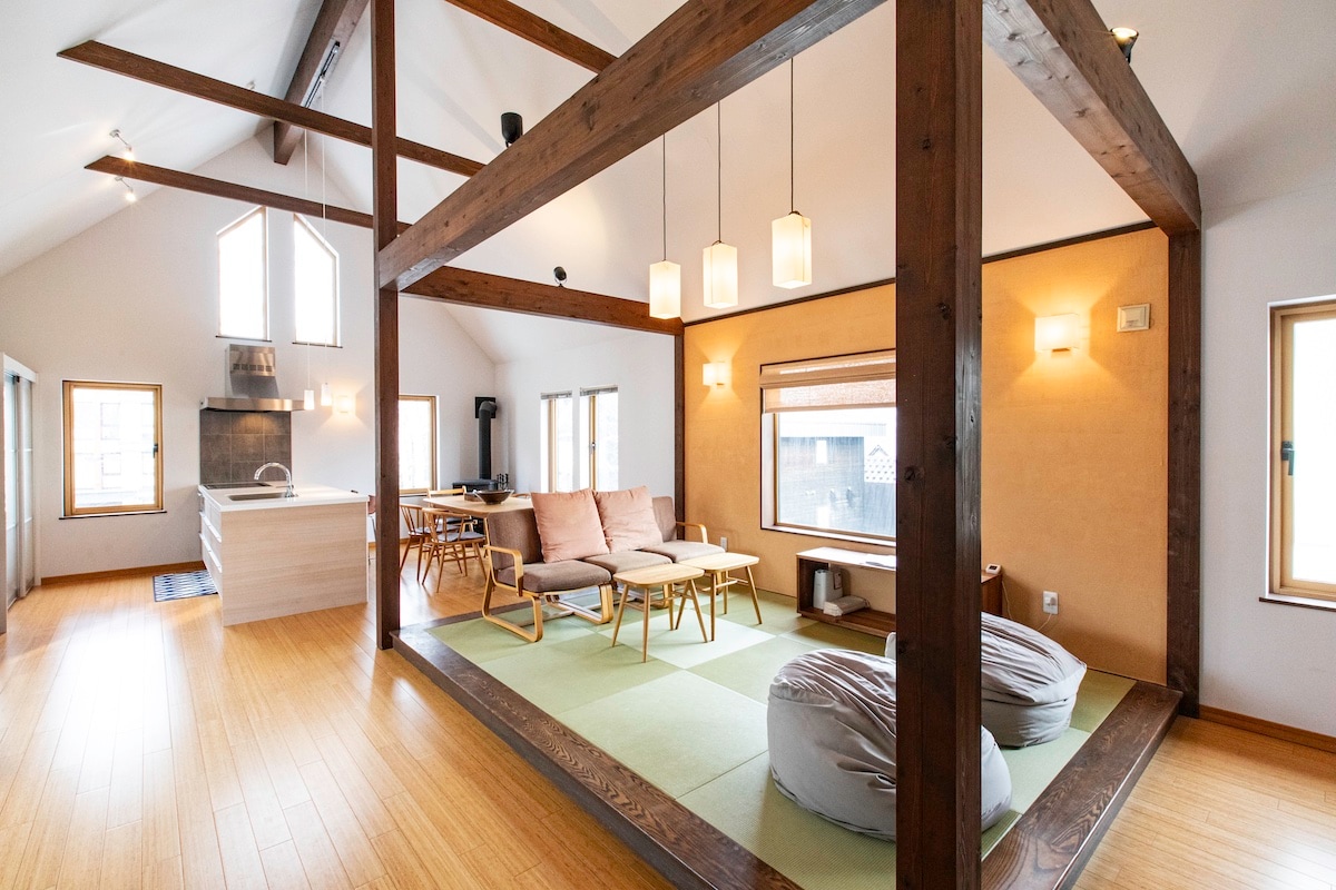 The chalet is located close to restaurants and just a few minutes walk to the Hirafu intersection & convenience stores. This villa has 2 x Japanese tatami bedrooms on the 1F, which sleeps 6 people on futons. The 2F with lots of sun light has an open kitchen and tatami area. There is large Japanese style Hinoki wood bath tub in one of the two bathrooms. There is a TV with an HDMI cable for screening Netflix's etc (no local or cable TV). Free Internet (WIFI). Car parking for 1 x car.