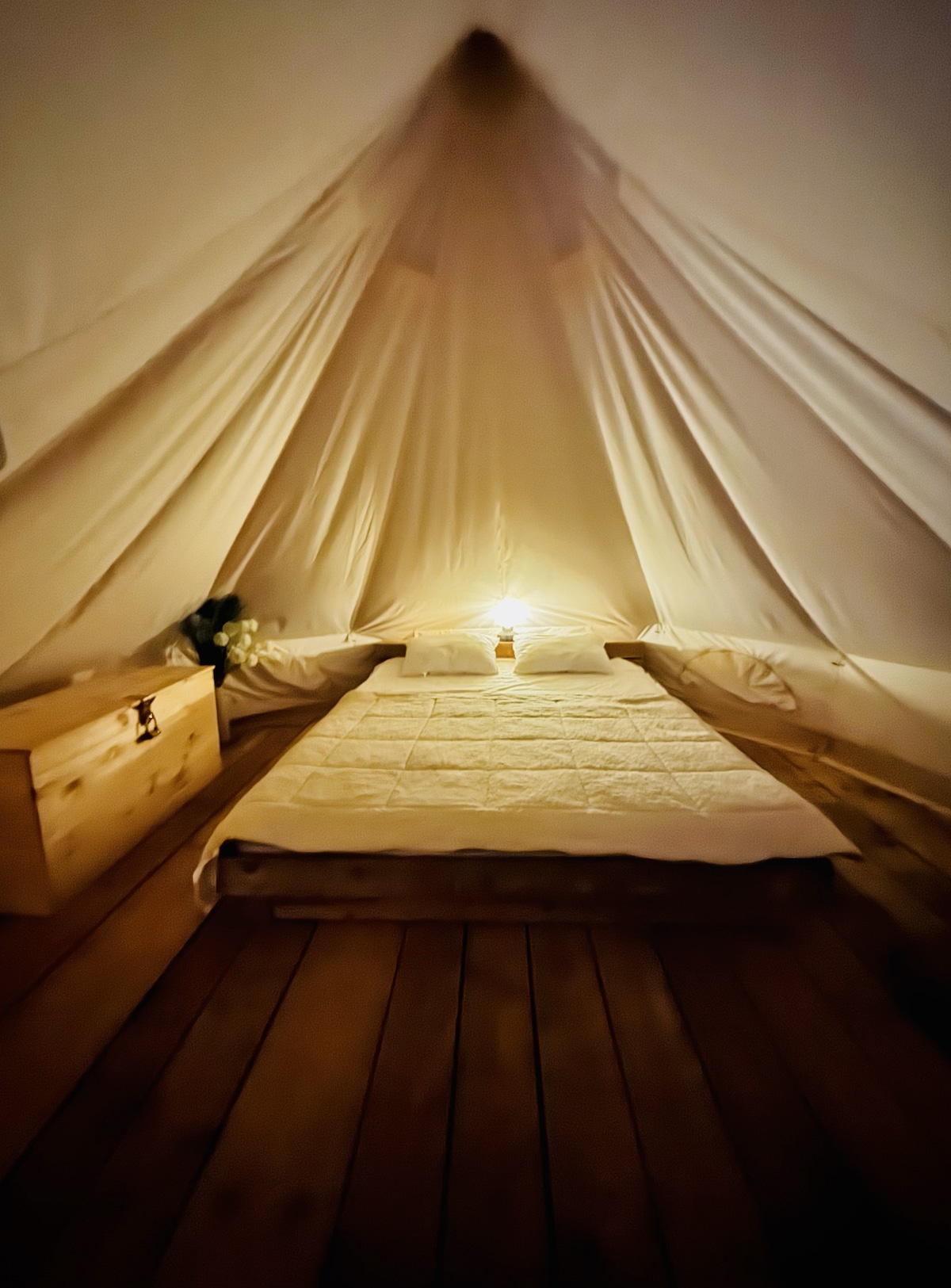 Relax in nature with comfort In a cherry orchard near Kutná Hora, we have created a peaceful retreat for nature lovers who do not want to compromise on comfort. Accommodation in a four-meter glamping tent offers comfortable accommodation for two. There is electricity, running water, a solar shower and a fully equipped kitchenette with a gas stove. The place offers complete privacy, beautiful views and ideal conditions for a romantic stay or a stay with friends. Enjoy the beautiful surroundings of this romantic place in the heart of nature