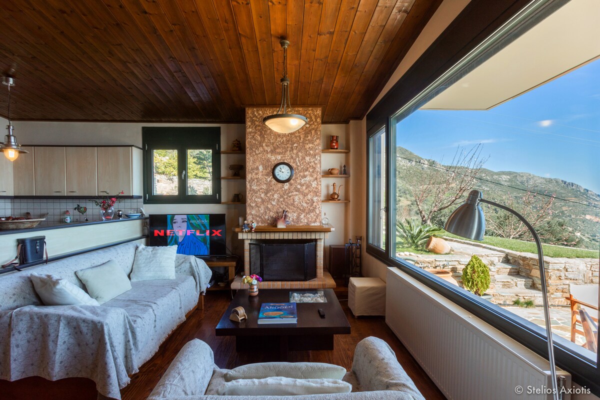 Independent whole house in Vrisi, Evia. It consists of 3 bedrooms, living room, kitchen and bathroom. It also has a large outdoor area (yard) with organic garden to which access is free. A great wood stove warms the living room. Terraces with views, is fully equipped with home appliances and home appliances in its kitchen, flat screen TV, WIFI. It comfortably accommodates 7 people, that means that every room has a king size bed and also there is sofa-bed in kitchen area.