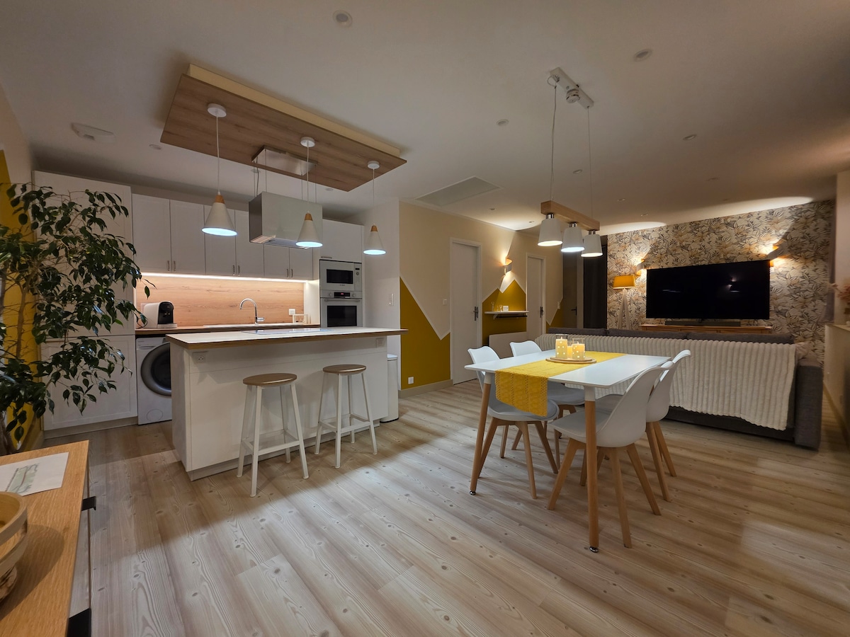 L'Emeraude est un appartement neuf de 55m2 dans une villa des années 1900 en plein centre ville de La Bourboule. A pied : à 2min des thermes et tous commerces du centre ville, restaurant, pizzeria, boulangerie. 5min du grand parc fenestre. Accès direct avec stationnement devant la porte 4 marches avec prise voiture. Prenez vos repas en admirant les monts du Sancy. Petit balcon 1 Chambre lit 140/200 + 1 canapé convertible 140/200 Grande tv ambilight oled Draps et serviettes fournis.