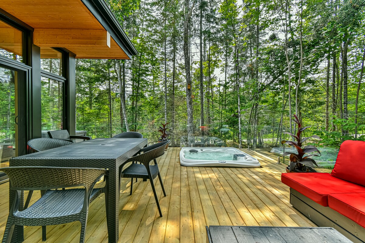 LIBRA CABIN | Refuge idyllique en nature - Spa et sauna sec offrant un lieu de détente ultime - Grande fenestration offrant une luminosité exceptionnelle inondant l'espace intérieur - Entouré d'arbres, niché au coeur de la nature - 2 grands patios offrant de nombreux espaces de relaxation - Foyer intérieur et extérieur - À moins de 15 minutes du Mont-Tremblant