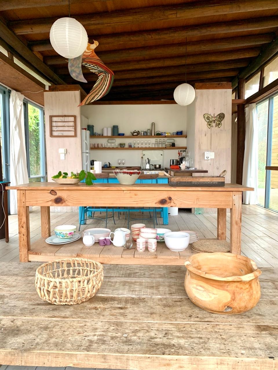 Beach and countryside house surrounded by magical nature. Located 13 km from La Pedrera and 21 km from Cabo Polonio. It has 2 bedrooms, 2 full bathrooms, a kitchen, a living room, an outdoor grill, a laundry room, and large decks with tables. Ocean views from the living room, kitchen, and both bedrooms. From the living room you can see the sunrise at sea, and from the dining room the sunset in the countryside.