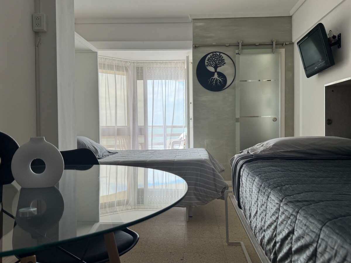 Beachfront. Oceanfront. A modern studio located on the second floor with a private balcony and a direct view of the beach. The space stands out for being bright and practical. Both the double and single beds are modernly designed, with high-density mattresses, which allows for space optimization. Separate kitchen, with window to the sea, equipped with refrigerator, microwave, breakfast station (electric kettle, toaster, juicer and coffee maker) and dishes.