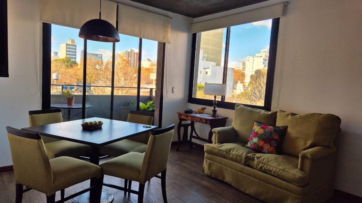 Super bright loft designed to combine calm, functionality, and a great atmosphere. Just 2 blocks from Hospital Español in La Plata and 10 minutes from Estadio Único and the city center. It features high-speed Wi-Fi, AC (hot & cold), a spacious balcony overlooking a green courtyard, and is fully equipped for long stays. Beyond the space, you’ll find a thoughtfully curated experience from start to finish—ideal for those who value not only the place, but also how they are welcomed.
