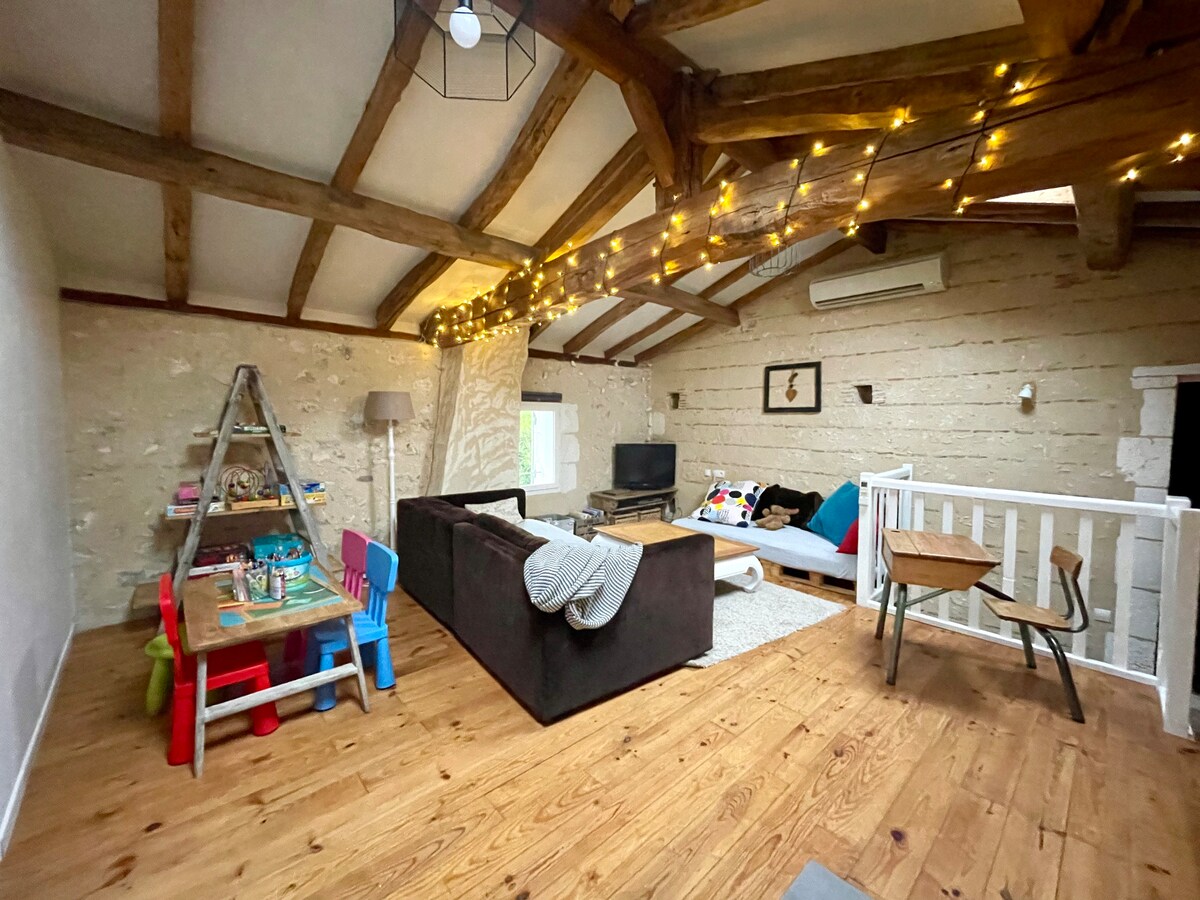 Charming apartment for rent 15 minutes from St Emilion in a peaceful and pleasant place in the middle of the Bordeaux vineyard. Consists of a large, spacious and bright room equipped with an American kitchen, an air-conditioned bedroom upstairs and a large terrace. The terrace is a privileged place for both rest and friendly meals. It is also bordered by a swimming pool (heated 26°) which allows for appreciable relaxation. Heated pool from May 25 to Sept 20