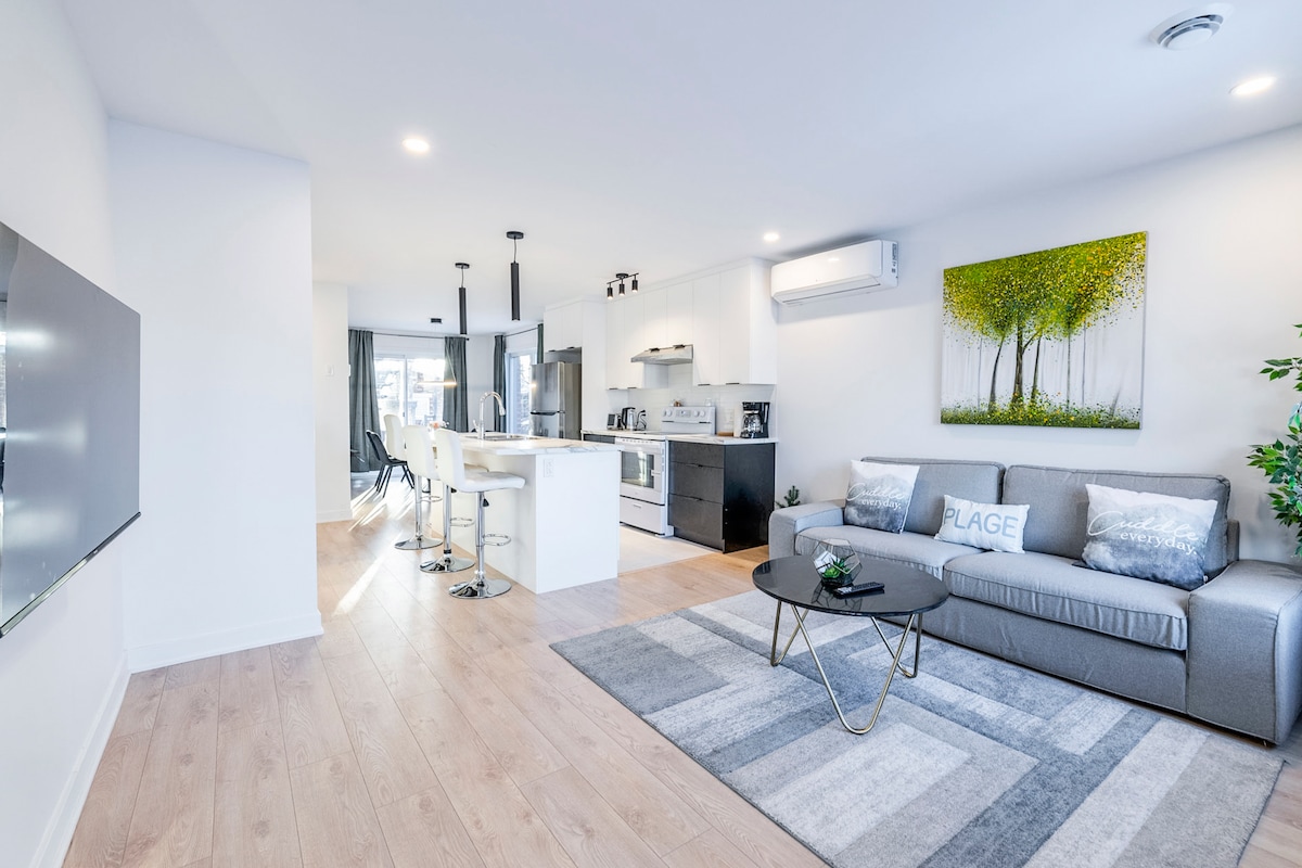 Modern Comfort near YUL Airport! This stylish retreat is just 15 minutes from YUL, offering a haven of modern comfort. You'll find everything you need for a relaxing stay, including a fully equipped kitchen to unwind in after a long day. Sit back, enjoy a complimentary cup of coffee or tea, and watch your favorite Netflix show. Book now and experience the perfect blend of convenience and style.