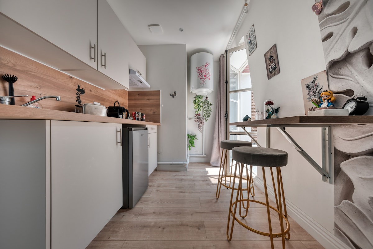 Welcome to my studio inspired by Alice in Wonderland. Here, every detail immerses you in a magical and slightly offbeat world, between crazy watches, busy rabbits and enchanted decorations. Located in the city center, a short walk to the train station, shops, restaurants and everything you need to enjoy. Perfect for a break for two, a short break or even to work quietly in an original atmosphere. Cozy, bright and well-equipped – all that's left is for you to bring the magic to life!