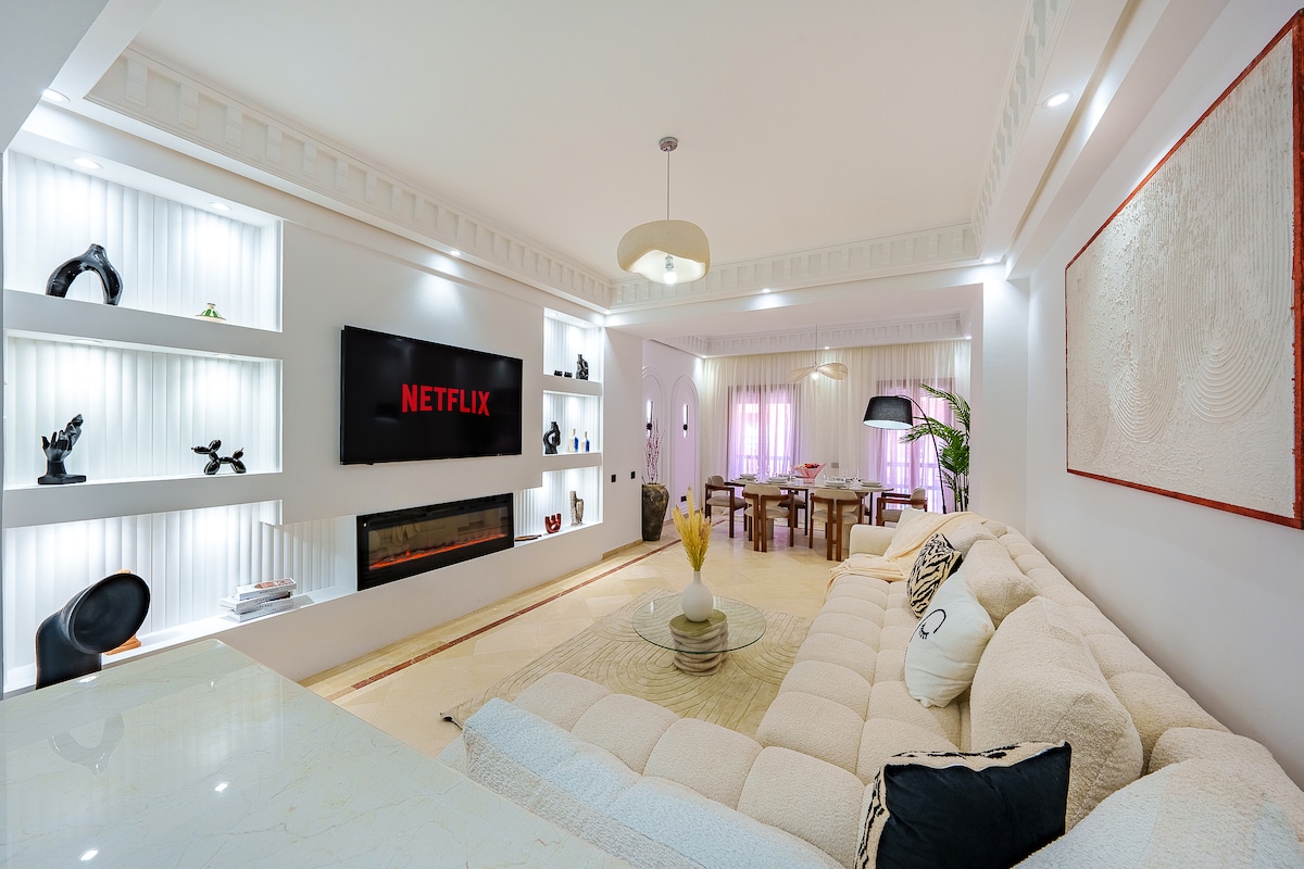 Super apartment tastefully and elegantly decorated in a beautiful 24/7 secure residence, All the necessary amenities are available on site, beautiful lagoon pool surrounded by a beautiful garden. Parking space available in the basement. 5 min from Almazar Mall 8 min from Menara Mall 11 min to M Avenue 14 min from the square