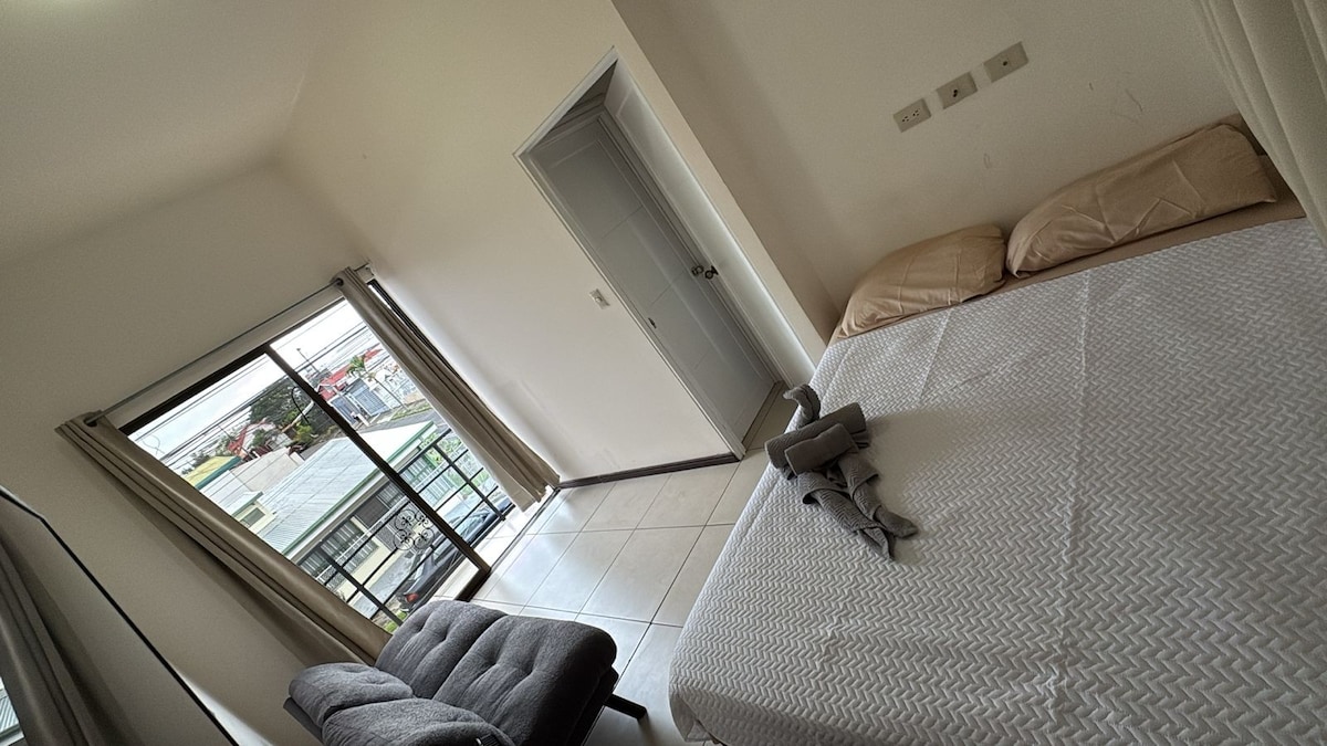 ¡Hola! Nuestro espacio está pensado para que tengás todo lo que necesitás. Restaurantes, piscina, gimnasio, lounge & BBQ, TV con ChromeCast, cama queen, espacio para trabajar desde casa, cocina completamente equipada, baño completo con agua caliente y un espacio de parqueo. Pasá tus días en un cómodo espacio a tan solo 15 minutos del Aeropuerto y con una excelente vista hacia las montañas y el bosque. A tan solo 15 min del centro de San José y en medio de muchos oficentros. Ema y Migue!