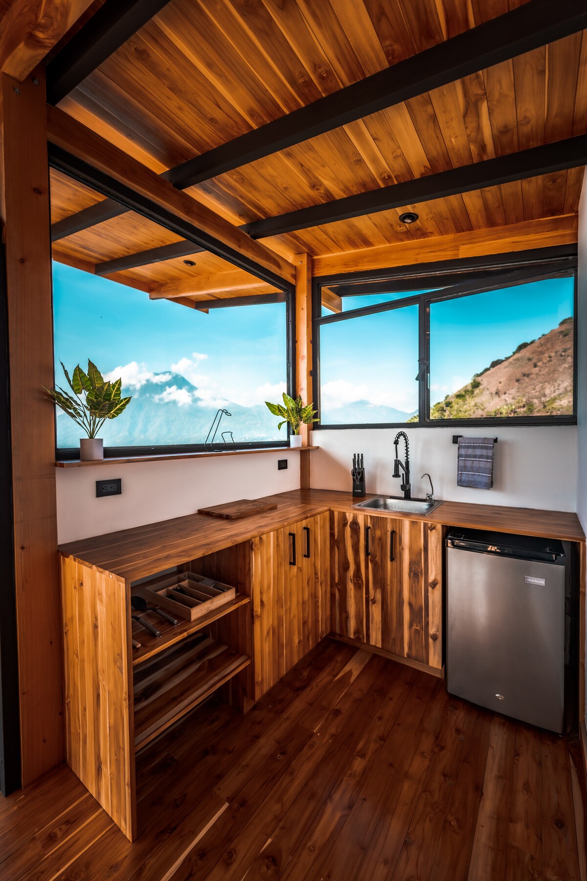 Very Unique & Modern Luxury House up in the Guatemalan Highlands with the sensation of floating up in the sky (1700m) -Features unobstructed Starlink connection with 24 hours of unbroken electricity (lithium/solar) -All windows folds fully open to greet the breathgiving views of 5 vulcanos and the “infinity lake” of the ever changing “painting” -Filtered spring water on tap -Bathroom hot tub for a closed or open door experience -12 m2 cantilevered hammock deck-net for stargaze & relaxation