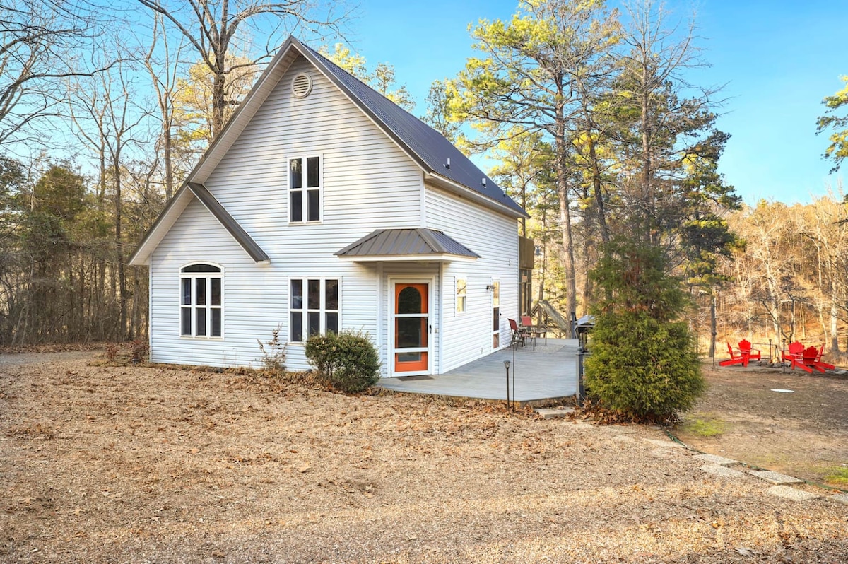This timeless nostalgic style cabin will take you back in time sitting on 8 acres all to yourself. Feel free to wander to the bridge and enjoy the park like setting and fire pit. Only 1.5 miles to Petit Jean St. Park. Open floorpan, 2 bedrooms & 1 bath downstairs. Upstairs loft has 2 single beds. Wood burning fireplace. Large kitchen, bar stools, new frame tv with Netflix, fully stocked kitchen, coffee maker, coffee and creamer provided. Covered back porch overlooking.