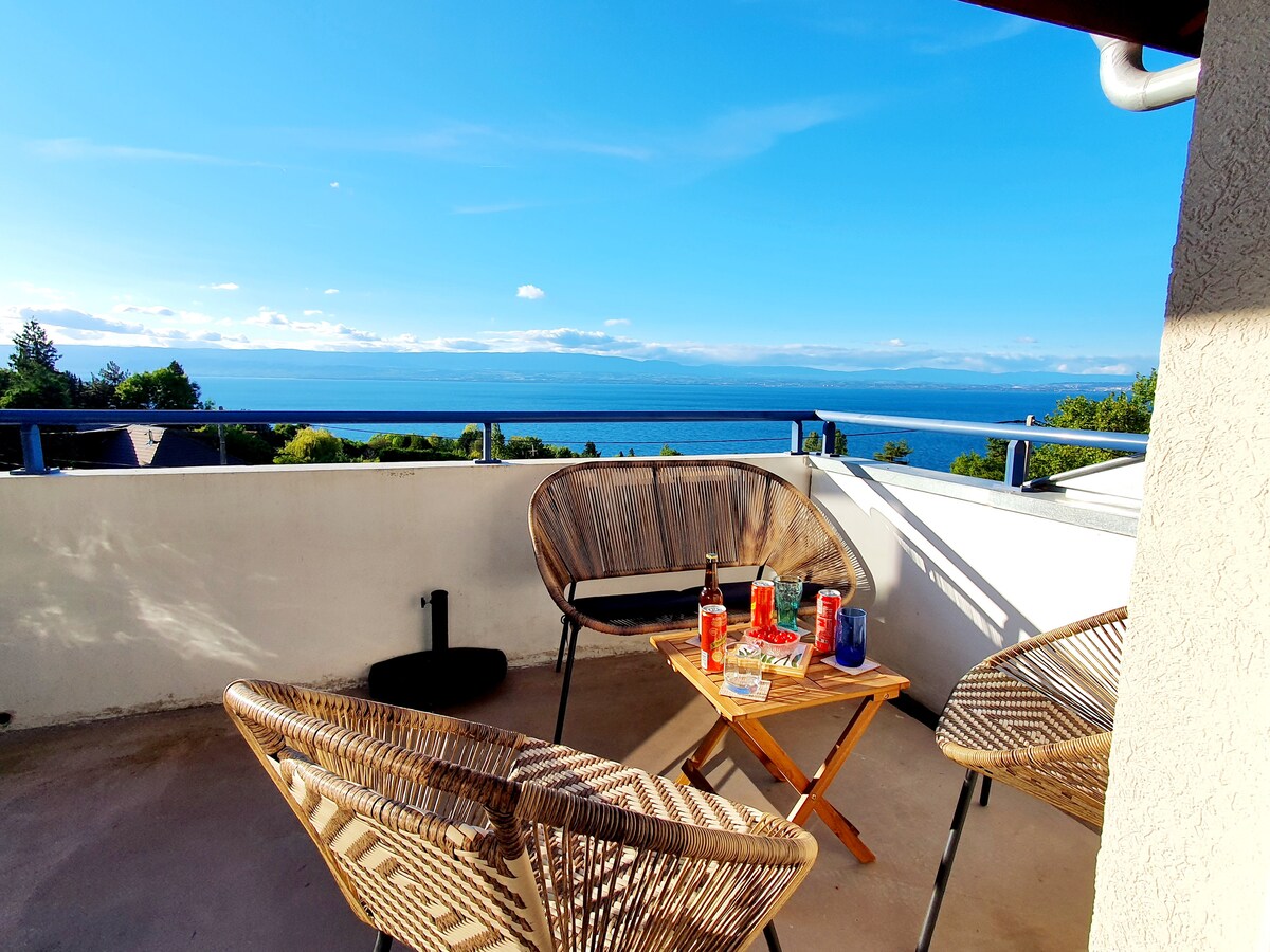 Exceptional apartment with panoramic views of Lake Geneva and the surrounding mountains. Without a vis-à-vis, it will seduce you with the surrounding greenery and calm. The apartment is located in a residential area on the heights of Thonon-les-Bains overlooking the city center. It is ideal for summer and winter vacations with the nearby ski slopes as well as access to the lake. (2 mountain bikes, 1 canoe, 1 paddle available, TV with Netflix access)