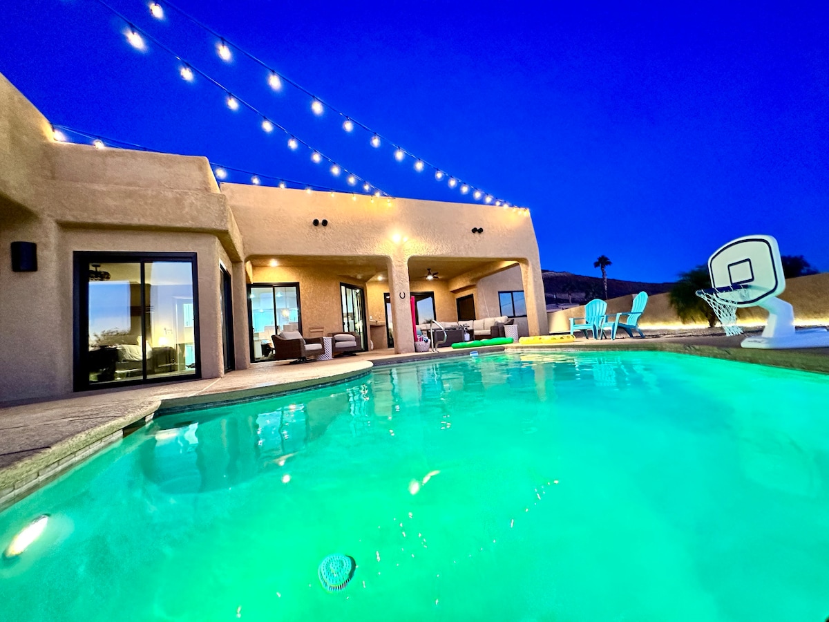 Havasu's #1 rated modern home. 2021 build 3 bed 3 bath lake view home /w pool & spa. NEWLY ADDED: living room plug-in play video game system wall HDMI port Perfect getaway! High end furnishing & technology. Yard has palms for privacy & outdoor kitchen patio cover. 5 min from Bridge & Main St 2 min from lake. Control4 home automation, KitchenAide/Wolf Appliances, Hunter Douglas motor blinds, 2 fireplaces, home theatre, outdoor kitchen, Phillips Hue lighting. Sonos sound & Restoration Hardware