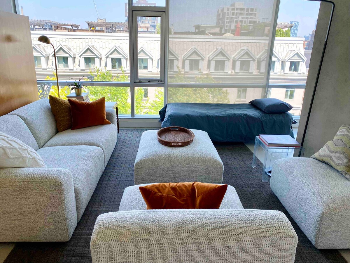 This unique 2 storey loft is super stylish and a rare find in downtown Toronto. This two storey loft has amazing 9 foot high ceilings finished fully modern kitchen and bathrooms. This super luxurious loft is perfect for nights out or gatherings. Ottoman in the living room is a pullout as well as the chair upstairs in the bedroom, just inform if you want setup and the air bed in the master upstairs is also a twin Equipped with a balcony.
