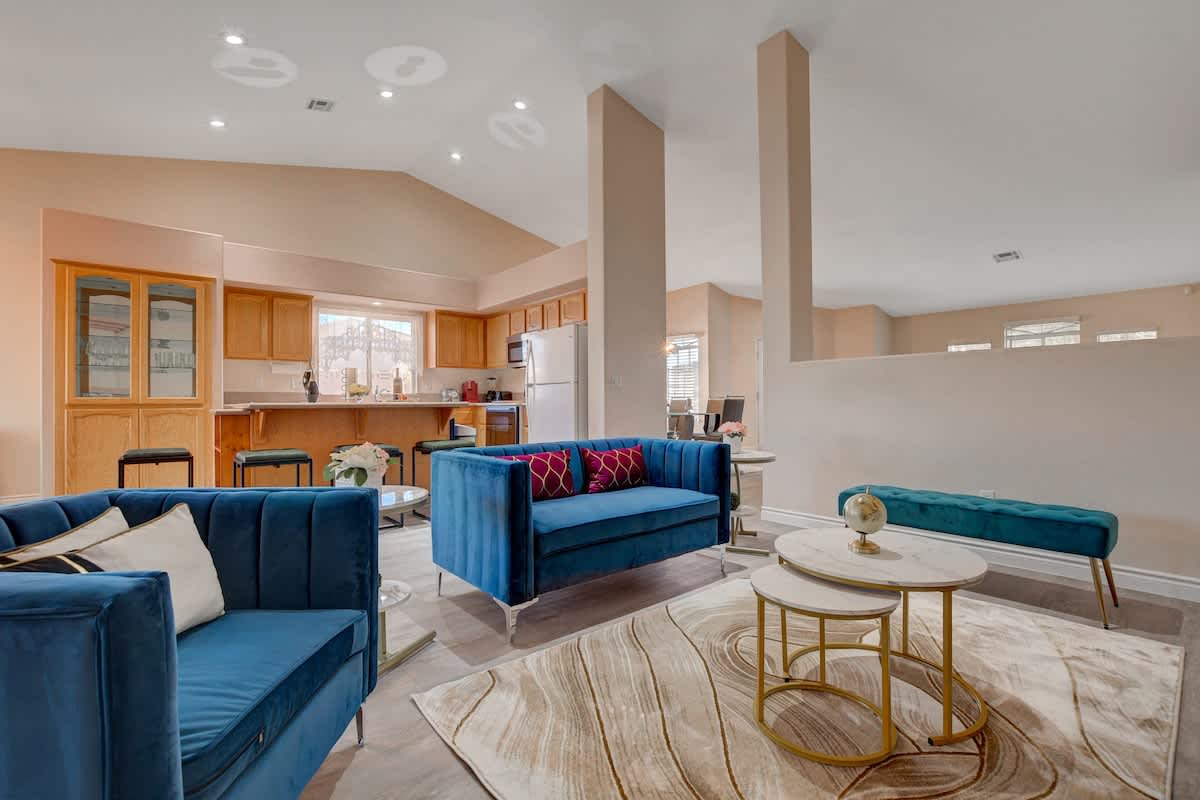 🌴 Long term visitors welcome! Private pool + spa (complimentary spa heating), cardio room, Samsung appliances, and modern upgrades throughout. Typically about 15–20 minutes to the Strip depending on traffic and destination. This 2400+ sq ft renovated home features one-of-a-kind furniture, an 8ft sparkling chandelier, marble-style flooring, and a 75-inch Samsung 4K TV! NOTE: This is NOT a party space. Please be respectful of the rules and the lovely neighbors.