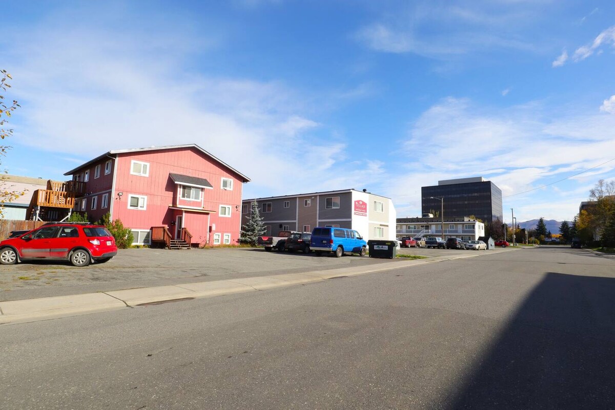 Welcome to Raspberry Suites! A beautiful 1 bedroom apartment with VIEWS of the Chugach Mountains. Thoughtfully decorated with "Alaskana" style and one of a kind Alaska Native art. This rustic retreat is right in the city and truly is the best of both worlds 5 minute drive to airport 10 minute drive to downtown 5 minute walk to DeLong Lake 5 minute walk to restaurants, coffee shop, liquor store, BUS STOP Close to Kincaid Park Apartment is on the second floor and is a walk up No Smokers Allowed