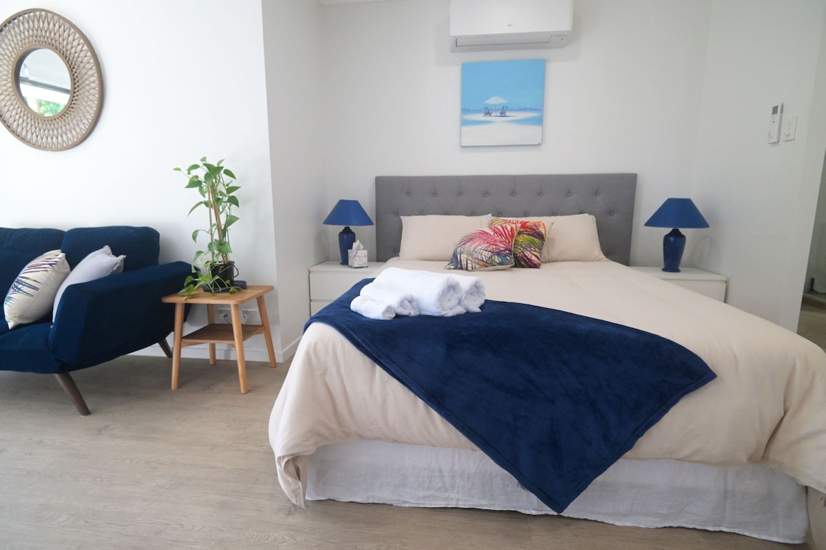 Studio 17 is a separate self contained one bedroom, air-conditioned studio with private entry and off street parking. Located on our premises and just 3-5 minutes to Hastings Street by car (40 minutes if walking) and Noosa Junction dining, the studio is also located within walking distance to Noosa's Farmer's Markets, Noosa River, cafes, restaurants and Aldi for grocery shopping. Your hosts Susan and Mark invite you to stay a while, enjoy the Noosa Lifestyle in complete comfort and security.