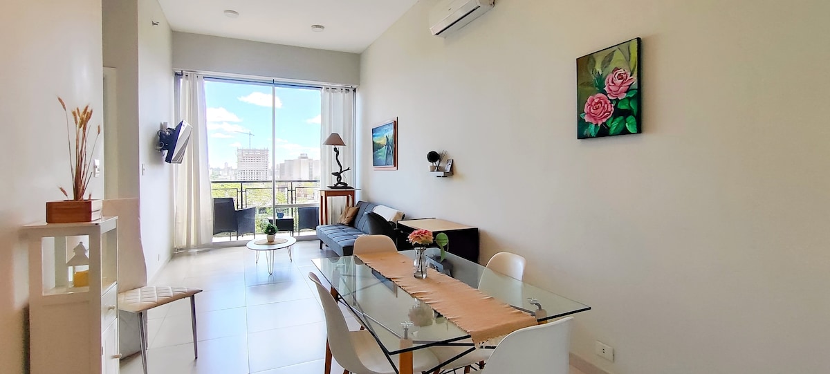 Your escape with a beautiful view. Enjoy this modern and bright apartment, ideal for resting or working in total comfort. Located in a safe and well-connected area, 20 minutes from everything you need. The space has a private garage and access to a terrace with a pool to relax at the end of the day. It also offers a comfortable bed, equipped kitchen, WiFi, washing machine and air conditioning. Perfect for couples, solo travelers, or business stays. Your place in Asunción awaits!