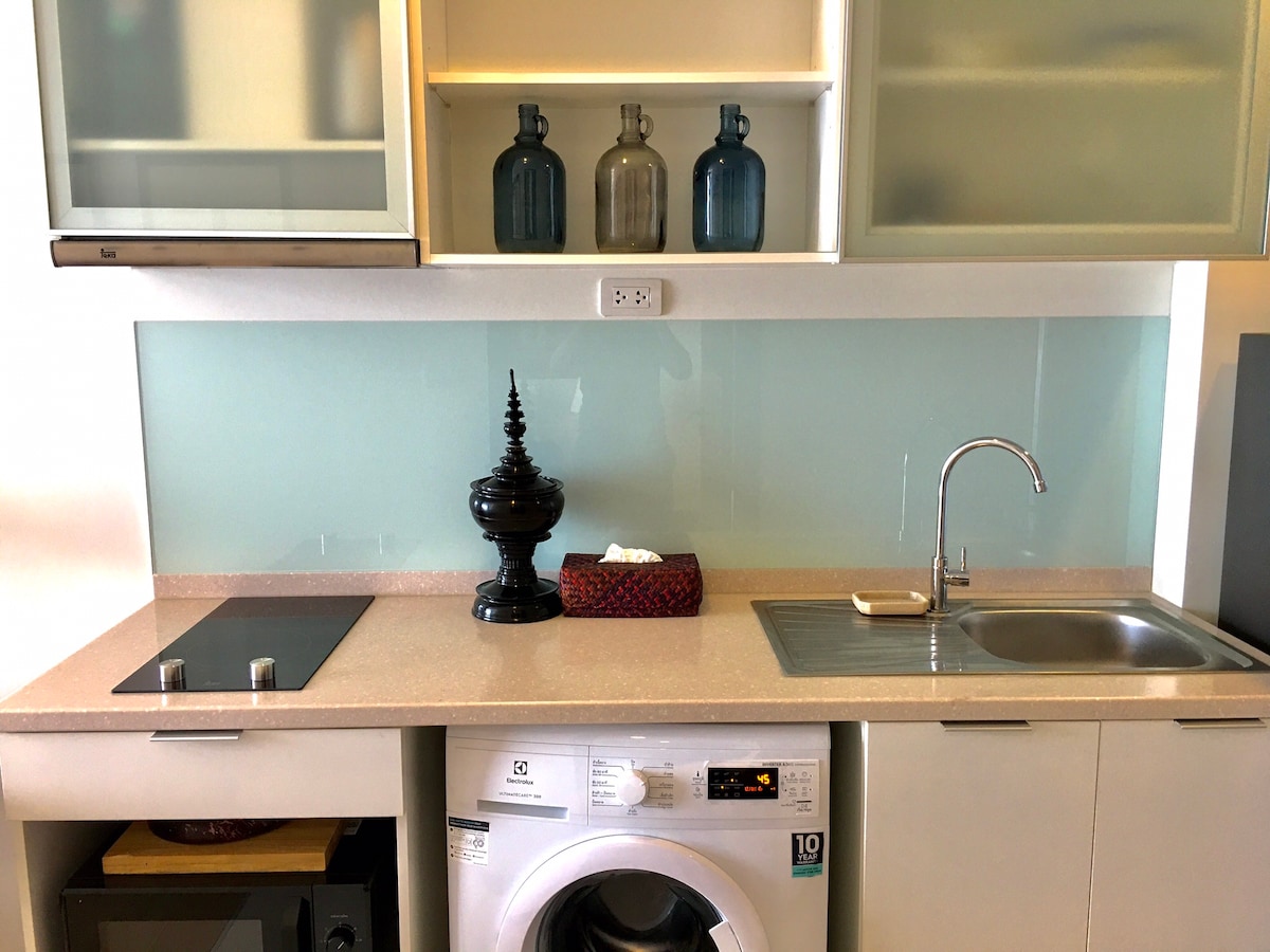 Soak up the modern charm of this nice decorated room. Fully furnished with all electric appliances that enhance the comfort of your stays ! The entire place will be yours [bedroom, bathroom,kitchen & living space] Soft&comfortable King size mattress & Muji bedsheet set. Free Wifi , 60" SmartTV + can watch your own Netflix, Air purifier, washing machine with drying function , iron , microwave oven , fridge, Electric hob & cooking utensils. Bathroom with rain shower & hot water machine.