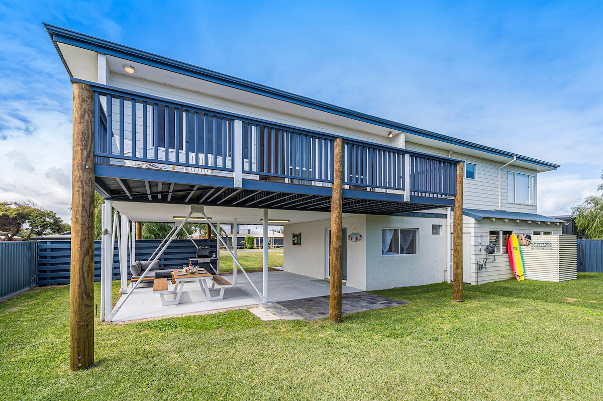 Welcome to our contemporary 14-sleeper Scandi-style beach house, offering a sophisticated two-story design just a stone's throw away from the Moore River and Guilderton beach. Designed for functional comfort, this stylish and large family holiday home invites you to experience Moore River, with luxury plush beds, a top-notch open kitchen, ample seating on comfy couches, solar panels, EV-charger and three expansive decks boasting stunning views.