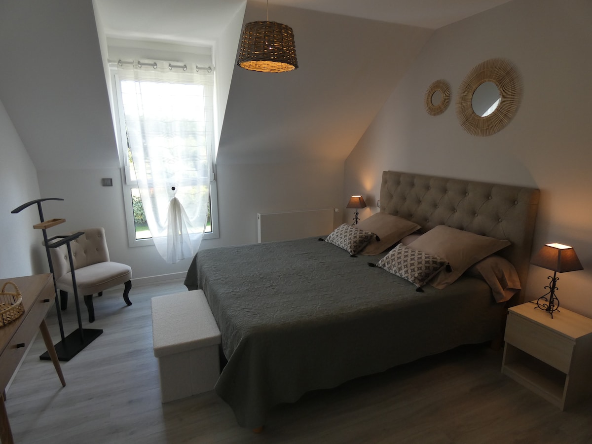 Peaceful and well-insulated house 2 steps from Lorient and Port-Louis. The entire 1st floor is reserved for Airbnb with 2 beautiful bedrooms with double bed, a large bathroom with shower and toilet, a 2nd toilet with sink, towels, herbal teas, fan available at no extra cost. Breakfast free. I am 1 km from the shuttle boat to Lorient. Port-Louis is a 5-minute drive with its beautiful beaches. I have a very nice dog and cat, I can keep them away if you wish.