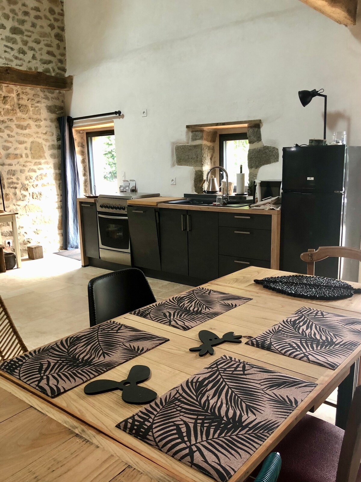 La P'tite Ferme is located 3 km from Combourg, a pretty town with a castle overlooking the lake and with all the shops. Ideal location for discovering our beautiful region: Mont-Saint-Michel, Cancale, Saint-Malo, Dinard but also Rennes, Fougères. Renovated with healthy materials, you will feel good in this elegant industrial/recycled atmosphere. Outside you will enjoy a south-facing terrace and a covered pergola to the north.