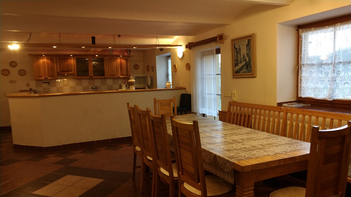We offer you a beautiful cottage in complete privacy surrounded by nature. The cottage is located in Malé Kyšice with a large garden, a stream lining the garden and a sauna. It can accommodate up to 7 people. The first bedroom is located on the ground floor where there is a spacious double bed. There is also a living room and a dining room. One person can sleep on the leather sofa. The kitchen is fully equipped, including a dishwasher and a large fridge with a freezer. On the upper floor, there is a second bedroom with a double bed and two single beds.