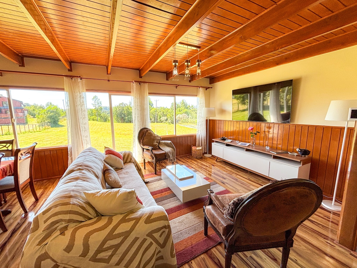 Beautiful cabin with great design and space in a private condominium. In it you will find comfort to enjoy as a family, as well as exclusive access through a walkway surrounded by forest that reaches the Maullin River. A quiet place to enjoy, relax, and have a good time. It is fully furnished and has 2 bedrooms, 1 bathroom and a large living room with all its utensils. It has heating. It is located just 10 minutes from El Tepual Airport and downtown Puerto Varas.