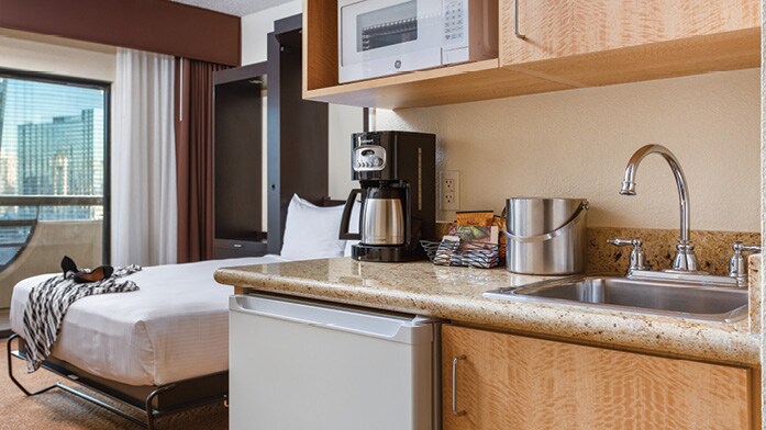 The Vdara is connected to The Bellagio and adjacent to ARIA Resort & Casino, steps away from shopping centers and gourmet restaurants. The Fountain View Studio has stunning views of the Bellagio Fountains, right from your room! • King-size bed with custom designed pillow-top mattress by Sealy • Living room with pullout queen-size sofa bed • Under-counter refrigerator • Two-burner electric cook top • Dining table for two • Large spa-style soaking tub