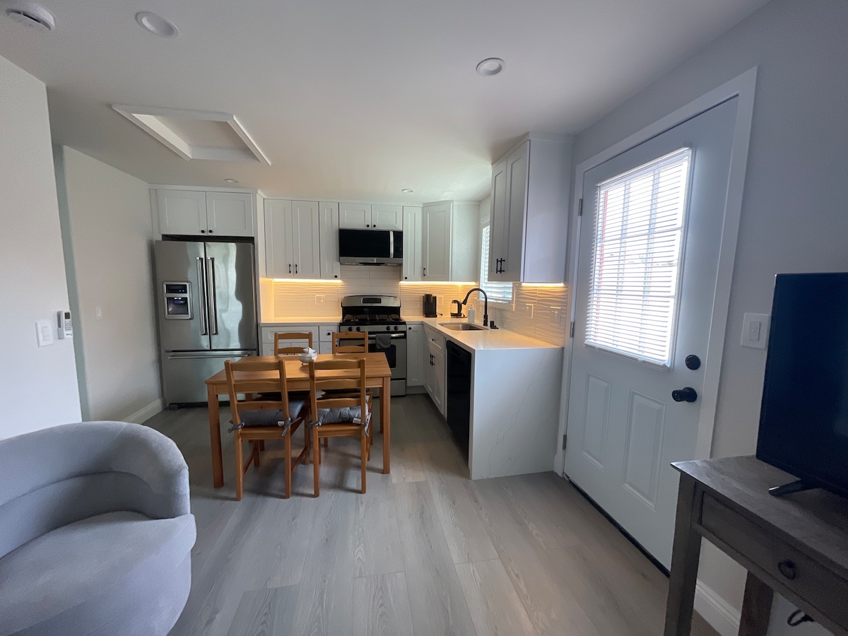 This is a comfy little studio attached to the main front property. You would have complete privacy with a private entrance and self-check in. The studio has a standard queen size bed (60x80in), bathroom, closet space, small dining table & a desk/office space. There is not a full kitchen, but the room has a mini fridge, microwave & k-cap machine. -Good for business travelers & solo adventurers -Free parking available on the premises