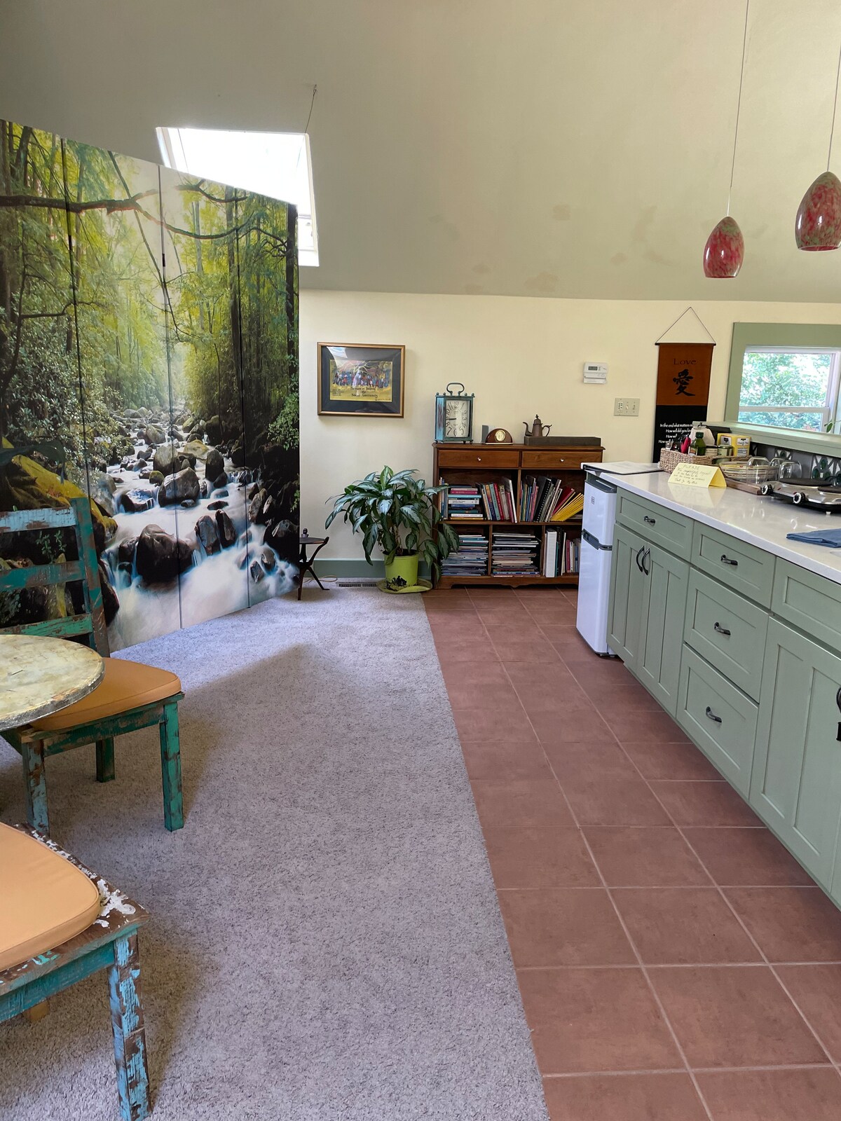 Get away and relax in a whimsical octagonal cottage surrounded by a lush garden, overlooking a swimming pond and the Wakarusa river. You will have everything you need for a romantic date night or an inspiring place to slow down and reconnect with nature. •1 bedroom open living space with lots of natural light and beautiful views. • Coffee cart with microwave and electric burner and mini frig are provided. • Paddle boat at the lower pond & 2 disc golf nets available for fun. •NO PETS ALLOWED