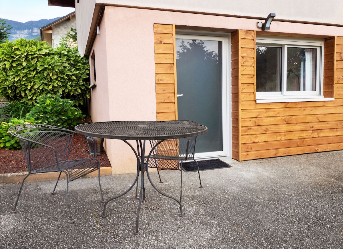 🏞️Studio bien aménagé de 30m2 proche de Chambéry. 🏆Meublé de tourisme classé 3⭐ 🛏️Lit double 140x200 Canapé clic-clac d'appoint espace salon : table basse, pouf 🛀Salle de bain séparé avec baignoire + WC 🌄Le logement est en rez de chaussée, avec une terrasse et un jardin clôturé ➡️Équipements : Frigo/Congel Combiné four micro-onde Lave vaisselle Lave linge Plaques induction Cafetière Nespresso classique ✅Draps et serviettes fournis 🔑Entrée autonome via boîte de clefs sécurisé