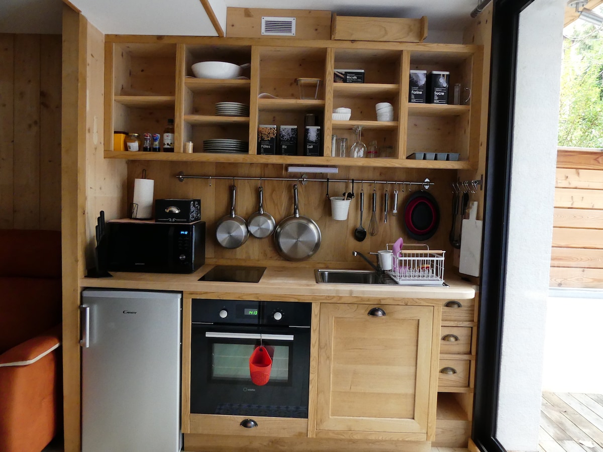 Hi, we're Aline and François. We offer to host you in our small chalet (large 2 rooms of 50 m²) located on the grounds of our house. Ideal for your ski stays or for spa guests, you will be only 30 minutes from the ski slopes (Collet d'Allevard and 7 Laux) and a 5-minute walk from the city center of Allevard and the Thermal Baths. Parking possible for 2 cars. Cats and dog on site.