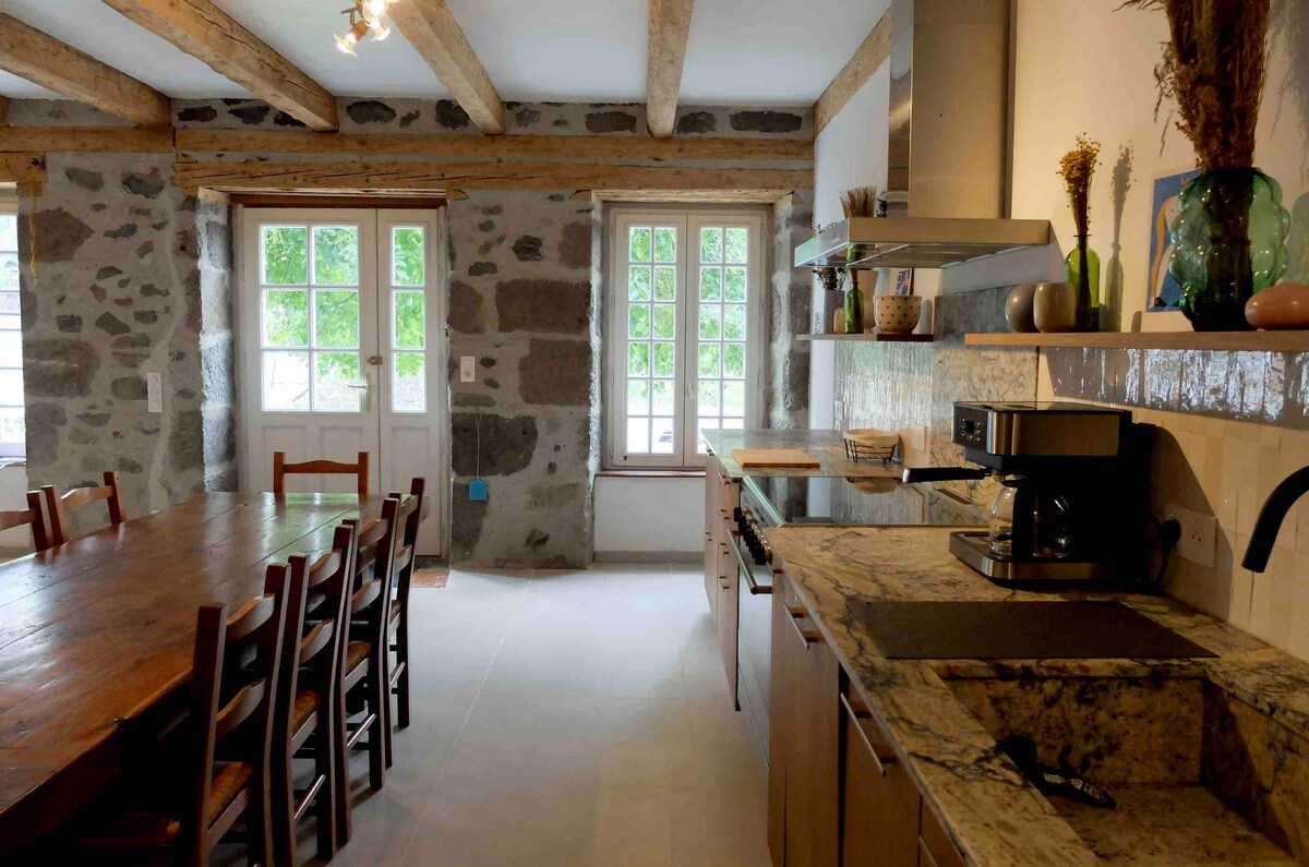 L'Impradine, a typical Auvergne house renovated with care in its green setting. Cantal is synonymous with calm, authenticity and wide open spaces. This is exactly what L'Impradine offers, with its 450 square meters, its 100 square meters dining room where you can share moments around the fire, the vast dinningtable or the table football, its living room bathed in light, its two reading areas and its private bedrooms and bathrooms.