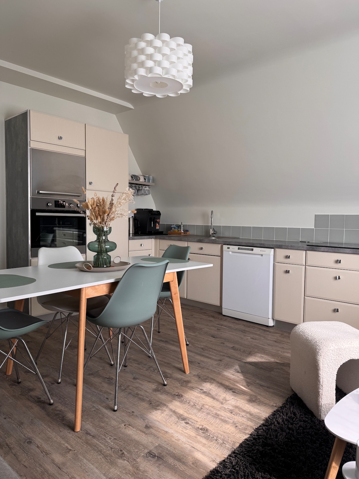 La maison d’Apolline is a charming little house located in Lassay-les-Châteaux, 2 km from the Château de Lassay and 15 km from Bagnoles-de-l’Orne in Normandy (a 15-minute drive). The house is composed of a ground floor (entrance, mezzanine, living room, dining area and kitchen) and a floor (bedroom and bathroom) fully equipped and offering free wifi. The metal staircase is central. The decoration is neat. The equipment is rather high-end.
