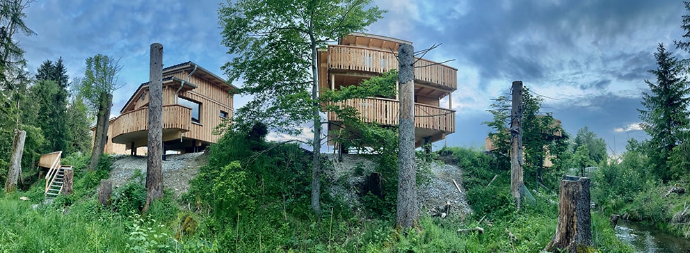 Man and nature meet at eye level. The deceleration begins upon arrival. The last approx. 150 m is from the parking lot on foot and with a ladder cart to the tree stilt house. There you will find a flowering and orchard meadow, a newly planted forest of partly still very small, native and foreign trees, a stream with a footbridge, two tree pulpits and in the middle three tree stilt houses. Across the street is the Haslach (bathing) lake on the Auerberg (1055 m).